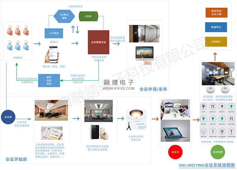 融靖IPAVS会议室预约平台采用电脑预订和手机微信预约结合的方式,免费开通、自主预约,免费发送预约通知,锁定会议时间段,支持显示屏,提供统计报表,提高会议室使用效率.融靖电子提供会议预约系统,成功案例众多,应用类型丰富,系统运行安全稳定.实现会议室在线预约和智能管理,会议预约,会务管理,智能会议室,多媒体,会议室预定系统高效稳定。